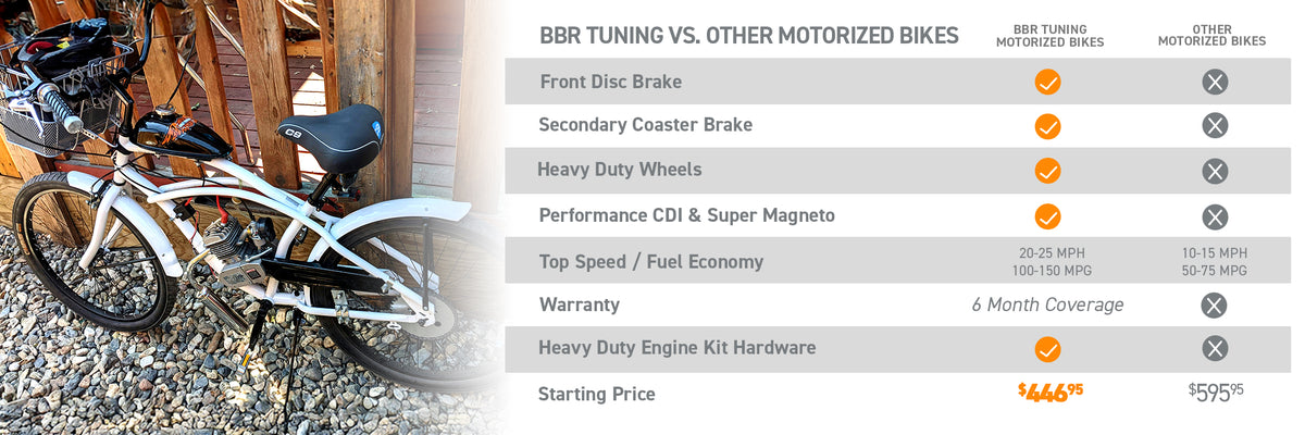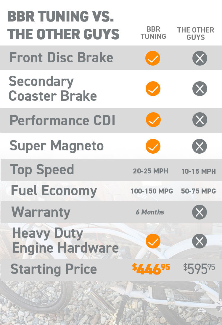 Each BBR Tuning bike engine kit gives you 2.75 HP and hits speeds up to 20 mph and higher. Plus it gets up to 150 mpg.