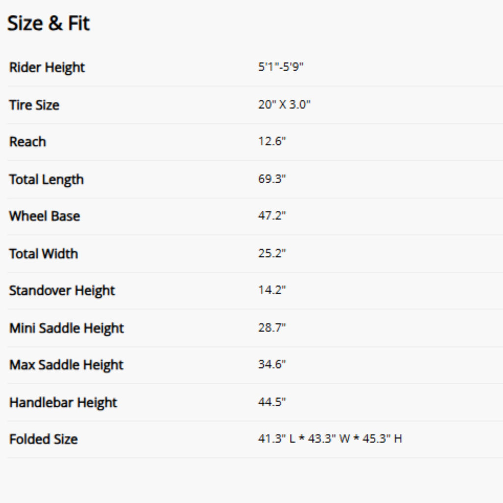 Tires: Front tire size of 20 inches x 2.4 inches; rear tires sized at 18 inches x 2.4 inches, offering stability and smooth ride quality.