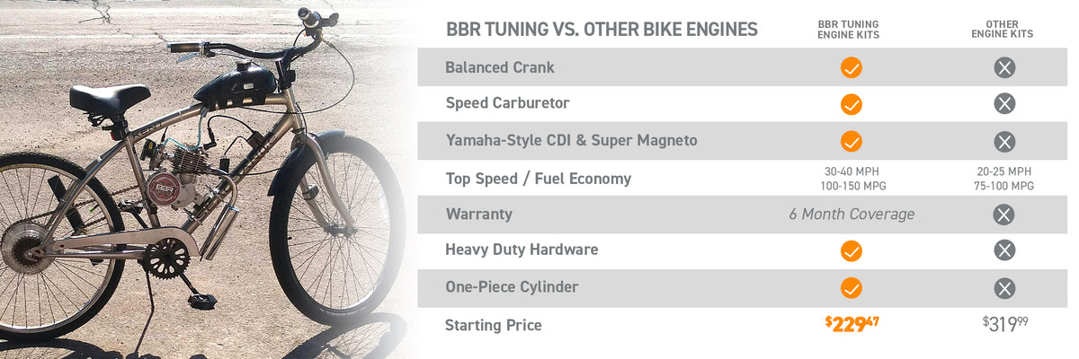 BBR Tuning bicycle engine kits are universally compatible to fit almost any 26" V-frame bike.
