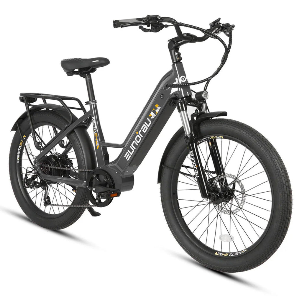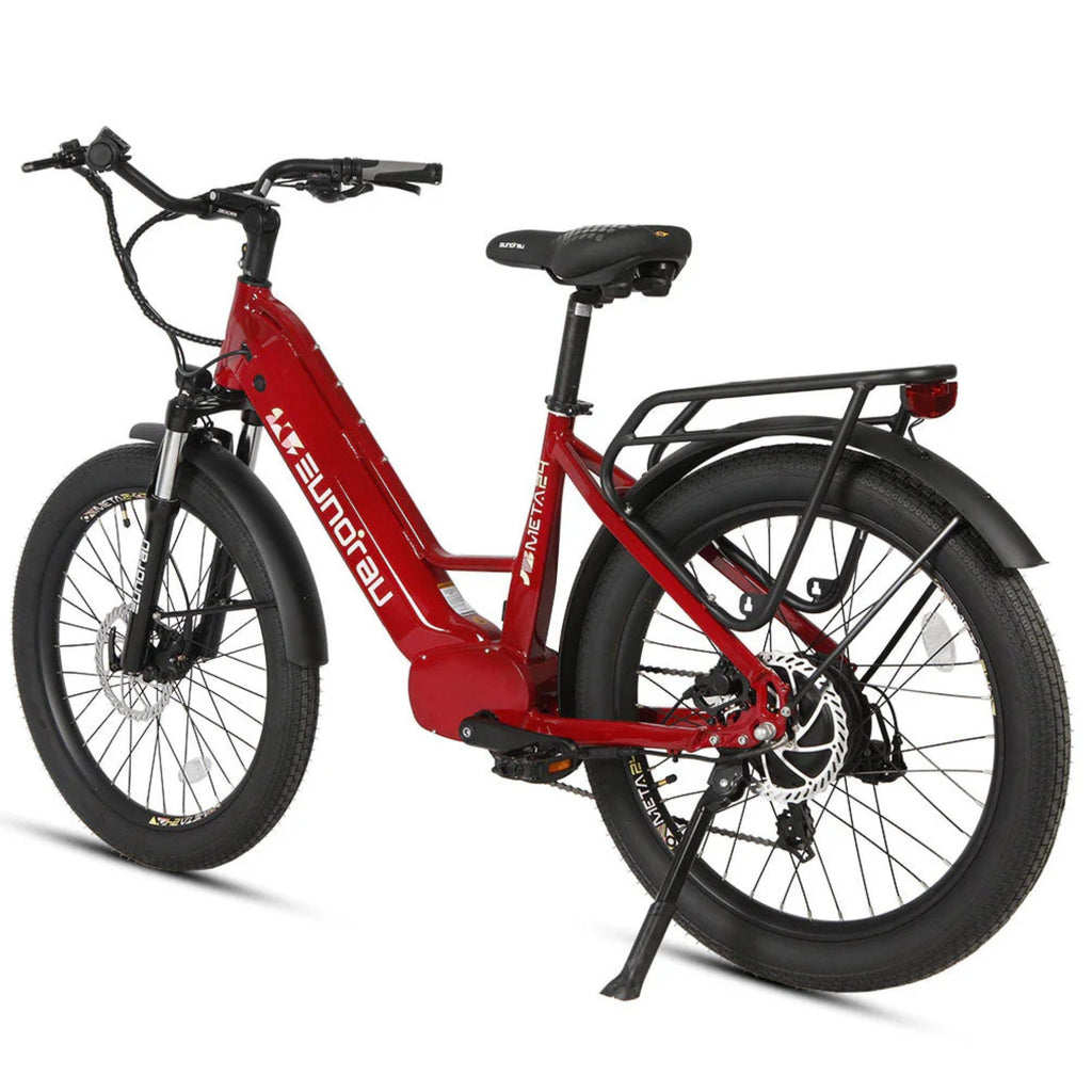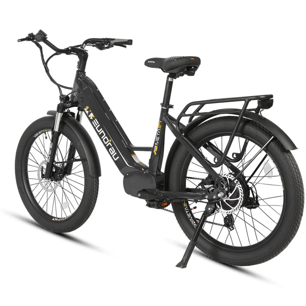 The Eunorau 500W 48V META Step-Thru Electric Bike is engineered to elevate your urban commuting experience. At its core is a 500W rear hub motor, delivering a robust 55 N·m of torque, allowing you to tackle city inclines and accelerate with ease. The integration of a torque sensor ensures that the motor's assistance aligns seamlessly with your pedaling effort, offering a natural and efficient ride.