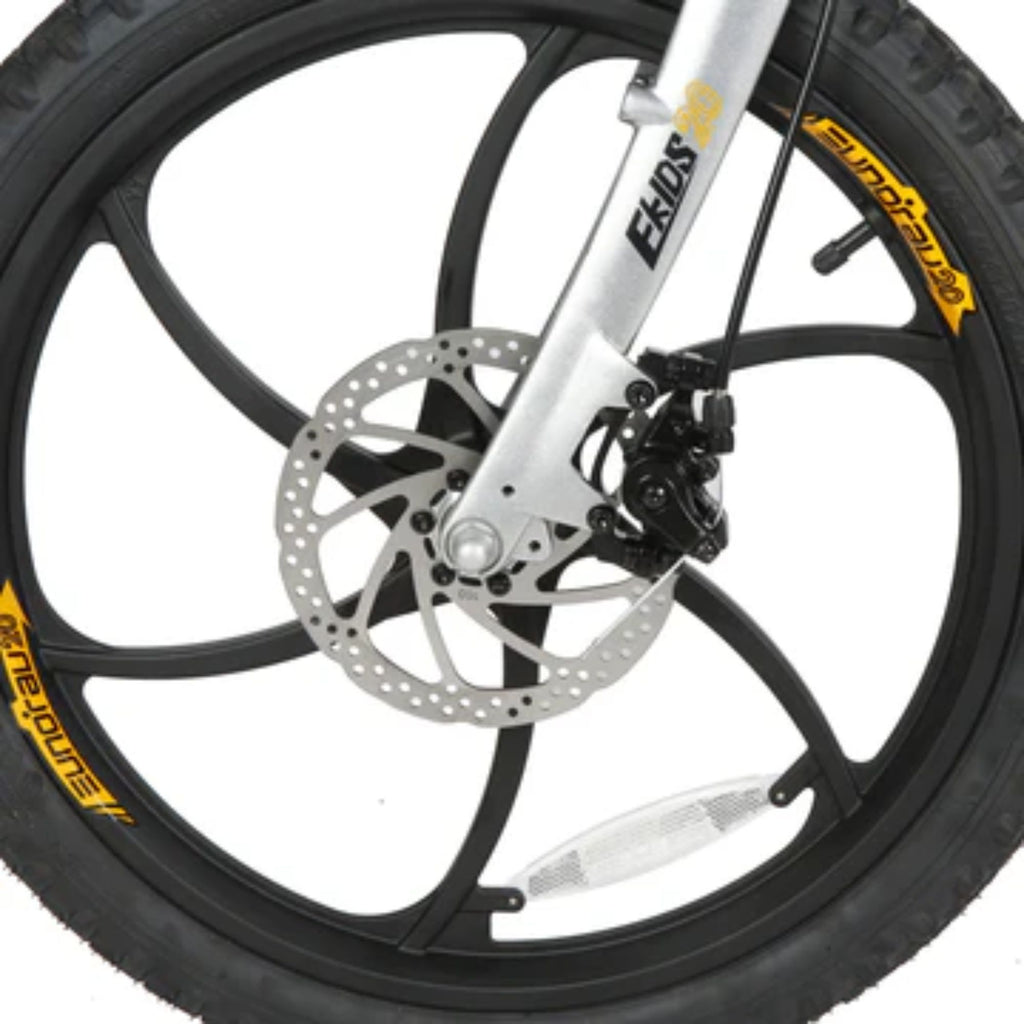 Safety is paramount in the EKIDS-20's design. The bike features front and rear dual-disc brakes that provide dependable stopping power, and a chain guard to protect against accidental contact with the chainring. The aluminum alloy frame, coupled with integrated die-cast front forks, offers durability without unnecessary weight, making the bike manageable for children.