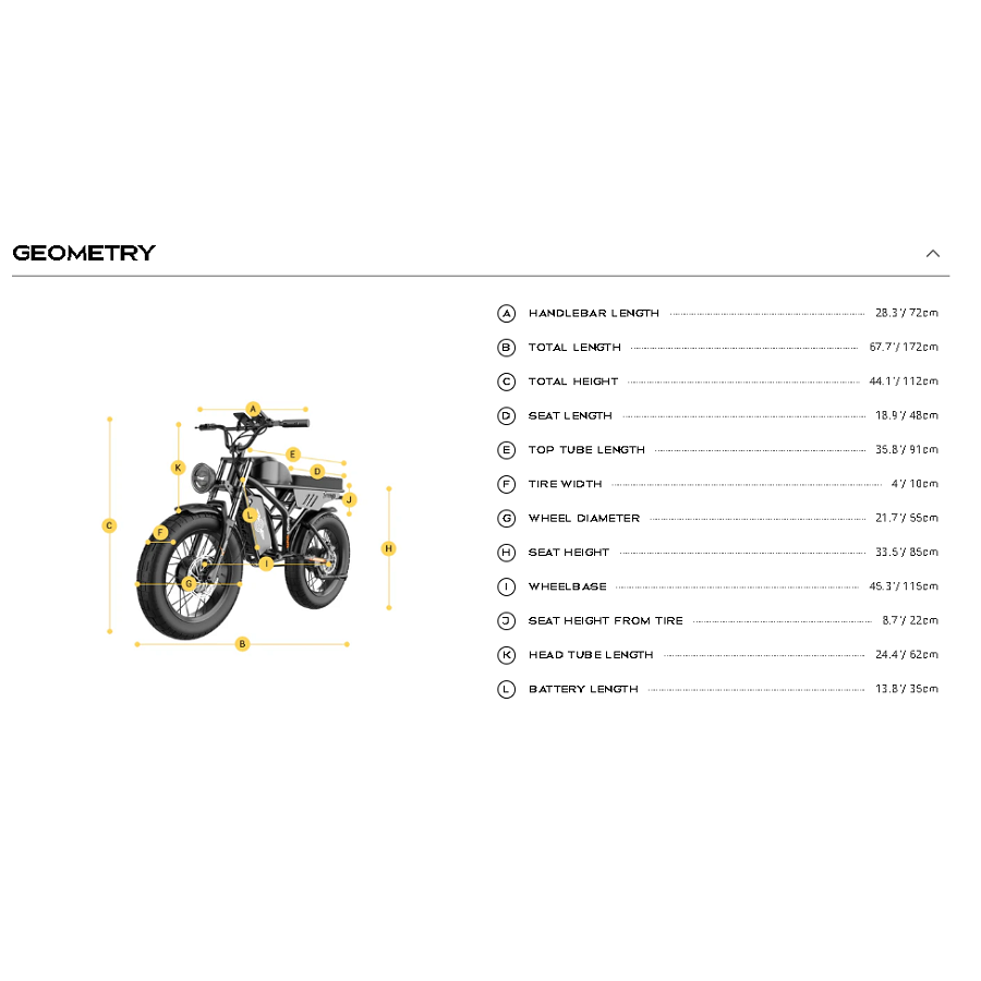 Wheel & Tires: 20″ × 4″ air-filled fat tires with tubes