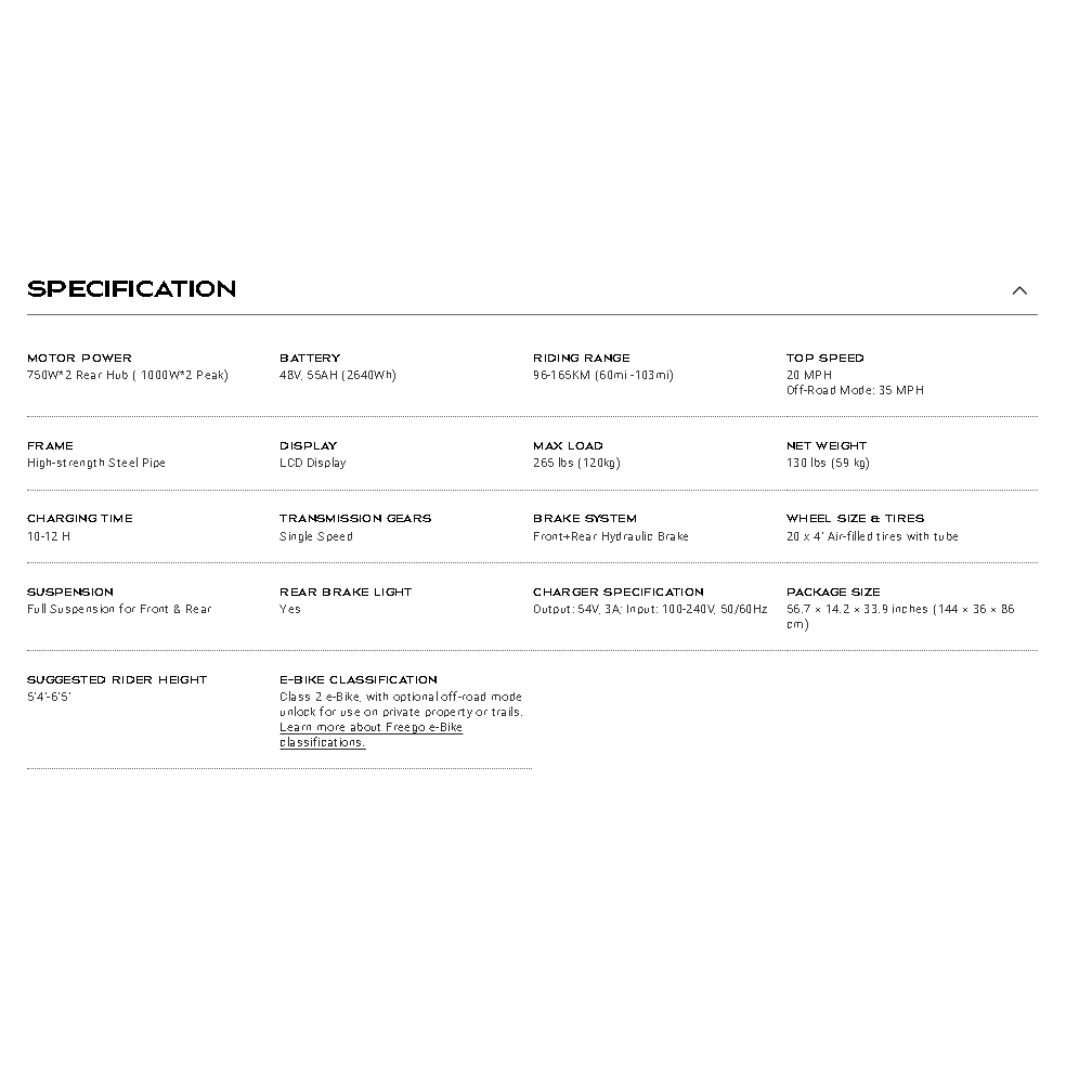 E-Bike Classification: Class 2 with optional off-road mode unlock (for private property/trails)