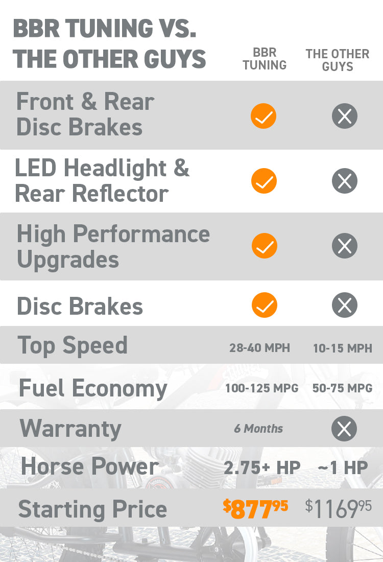 The BBR Tuning Stage 4 bike engine kit's equipped with a high compression head that's able to give this engine 2.75+ HP with top speeds reaching 25-40 mph. It also comes with a high performance carburetor for optimal airflow for more torque and speed. And they all come together to give you around 100-125 mpg.